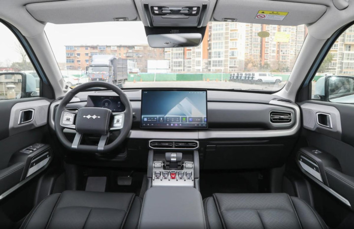 坐进车内之后,方程豹钛3闪充版的内饰布局同样是采用了家族化的设计,四辐式的方向盘以及水晶样式的物理按键和飞机档杆,也都能够提升车内的档次感。此外,方程豹钛3闪充版还配备了15.6英寸的中控大屏,虽然自研的车机系统表现达不到头部水平,但整体的功能体验和操作流畅性也能满足用户的日常使用需求。而在其它功能配置上,方程豹钛3闪充版还会继续提供车载移动冰箱,支持-6℃~6℃以及35℃~50℃的自由调节。此外,还有帝瓦雷品牌的音响系统,这些同样可以为用户营造更舒享的用车环境。